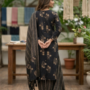 Midnight Bloom Block-Print Cotton Kurta with Striped Stole