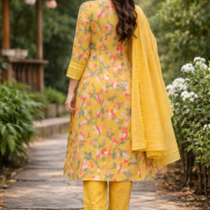 Sunshine Yellow Floral Batik Print With Hand Embroidery Chudidhar Set with Palazzo Hakoba Design