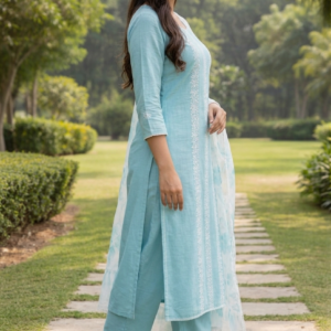 Aqua Blue Thread Embroidery Chudidhar Set with Dupatta
