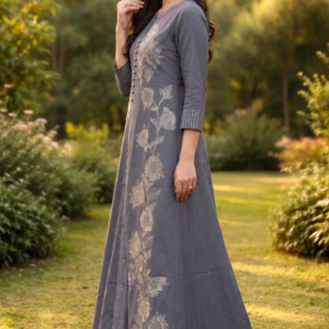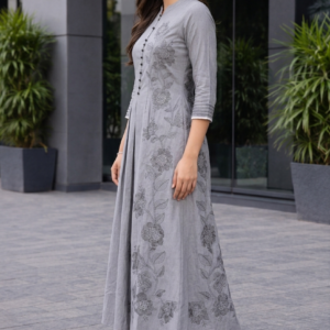 Elegant Grey Floral Embroidered A-Line Kurti