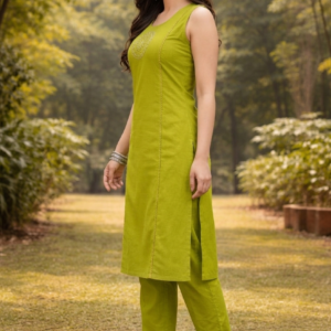 Olive Green A-Line Kurti Pant Set with Embroidered Yoke