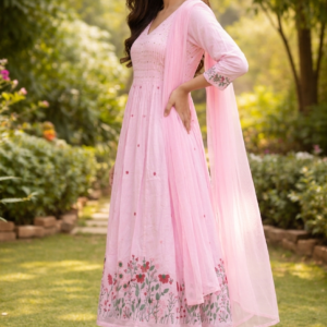 Blush Pink Floral Embroidery Anarkali Kurti Set